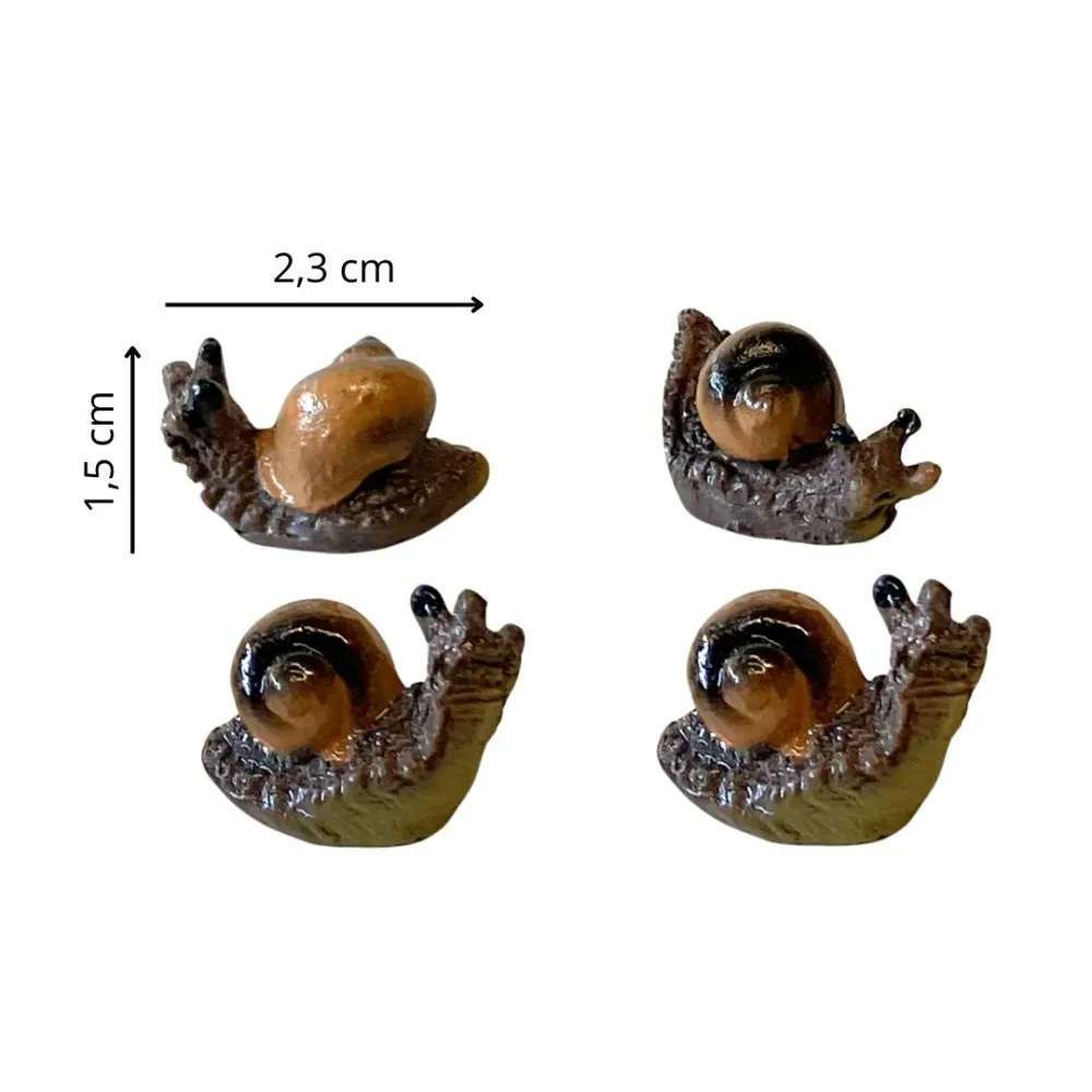 Set di 4 lumache in resina per statue da 30-35 cm, curate nei minimi dettagli e dipinte a mano con gusci sfumati e corpi realistici. Ogni pezzo presenta un guscio brunito con sfumature naturali e un corpo scuro ben definito, con attenzione ai particolari che rendono l’animale realistico e adatto a diverse ambientazioni. Ideali per arricchire orti, giardini, angoli verdi e scene rustiche del presepe.