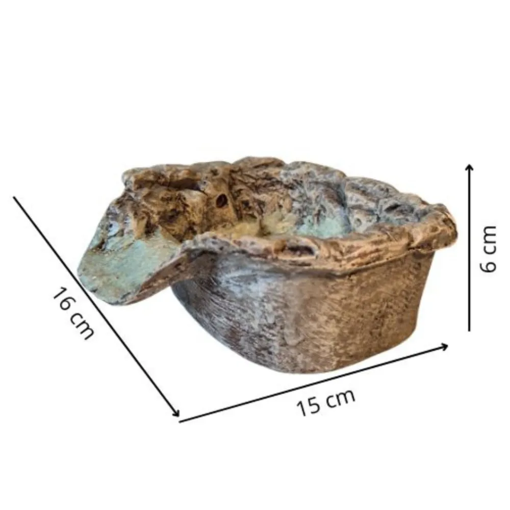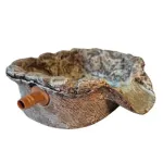 Resin Stream Source – Water Supply Basin. It is a miniature artificial stream source designed to serve as the starting point of a stream within a Nativity scene or a landscape diorama. The structure reproduces a small rocky basin, with an irregular rim that simulates a natural formation and a slightly inclined base that allows water to flow out naturally. The coloring reflects rock tones, with shades of grey, green, and light blue that suggest moisture and the presence of still or flowing water. On the left side, there is a small connector that allows attachment to a recirculating pump, useful for creating a realistic effect of water emerging and flowing downward to feed a stream or waterfall. This element is ideal for originating a watercourse within a natural scene, coherently completing the landscape and contributing to a sense of vitality and movement.