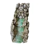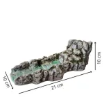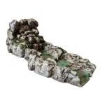 Long Resin Stream Source. This is a scenic element designed for Nativity scenes or natural dioramas, combining the function of a water source and a stream in a single continuous structure. The rear section depicts a rocky wall from which water emerges, then flows along an irregular bed shaped between stones and small reliefs. The entire composition is crafted with great attention to detail: the rocks are painted in realistic shades of grey and brown, enhanced with artificial moss and green tones that evoke the humid environment typical of flowing water areas. This stream source is designed to be connected to a recirculating pump, allowing water to flow continuously along the entire course. Ideal for creating a realistic and dynamic effect within a scene, it can be combined with other elements such as small bridges, mills, or Nativity animals to form a lively and harmonious composition.