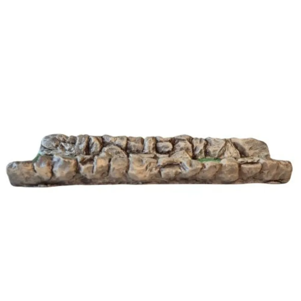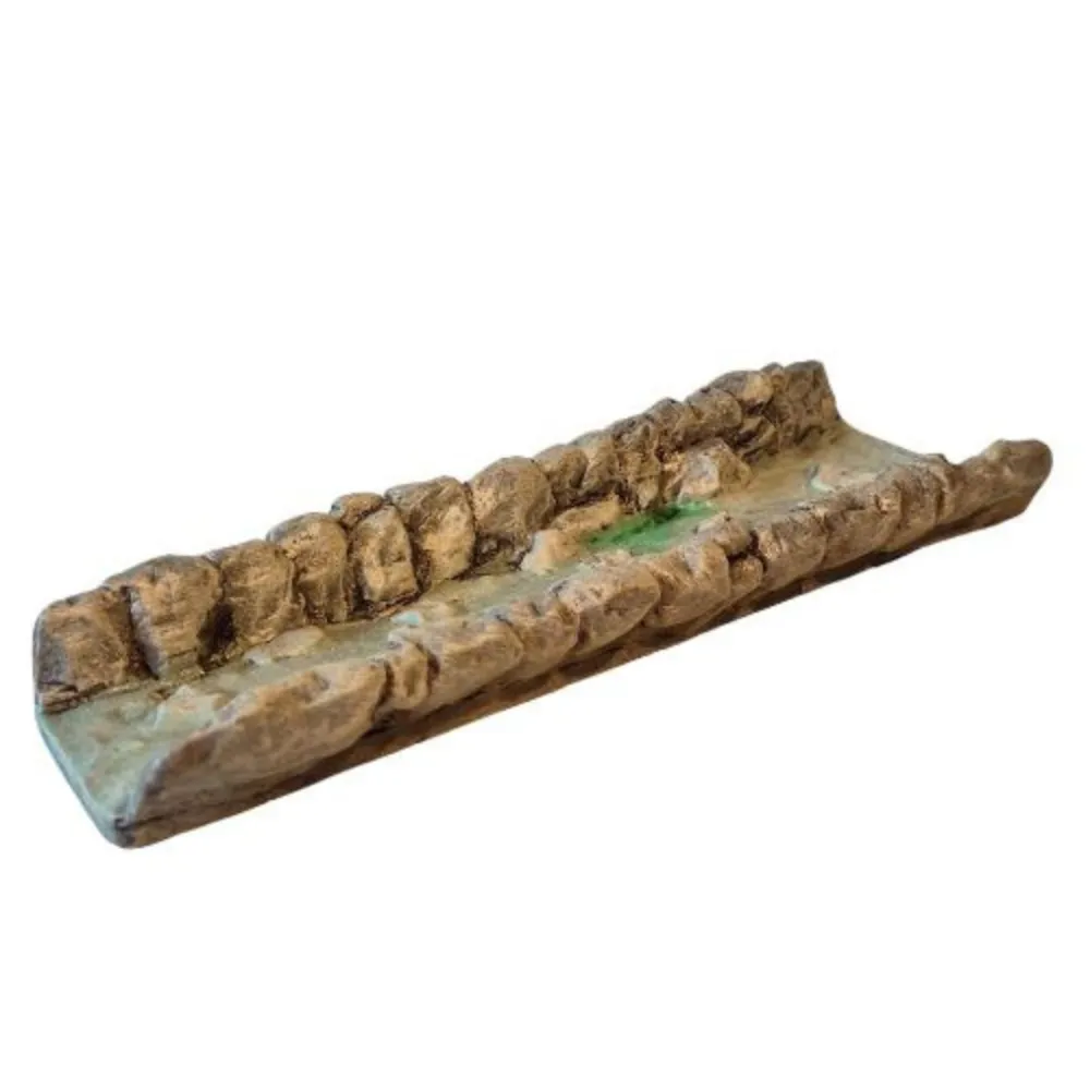 Modular Straight River Section in Resin. This is a miniature river element designed to enhance scenic settings such as Nativity scenes or naturalistic dioramas. The river appears as a straight watercourse, with irregularly shaped banks that simulate a rocky gorge. The riverbed is wide and scattered with stones, featuring greenish shades that suggest the presence of aquatic vegetation or algae. The coloration reflects natural tones: browns and greys for the rocks, with subtle accents of green and light blue to indicate water and moisture. This element represents a straight section of river and can be used on its own or combined with sources, waterfalls, or ponds to create a broader and more articulated landscape. It is ideal for adding depth and natural realism to pastoral or mountain scenes.