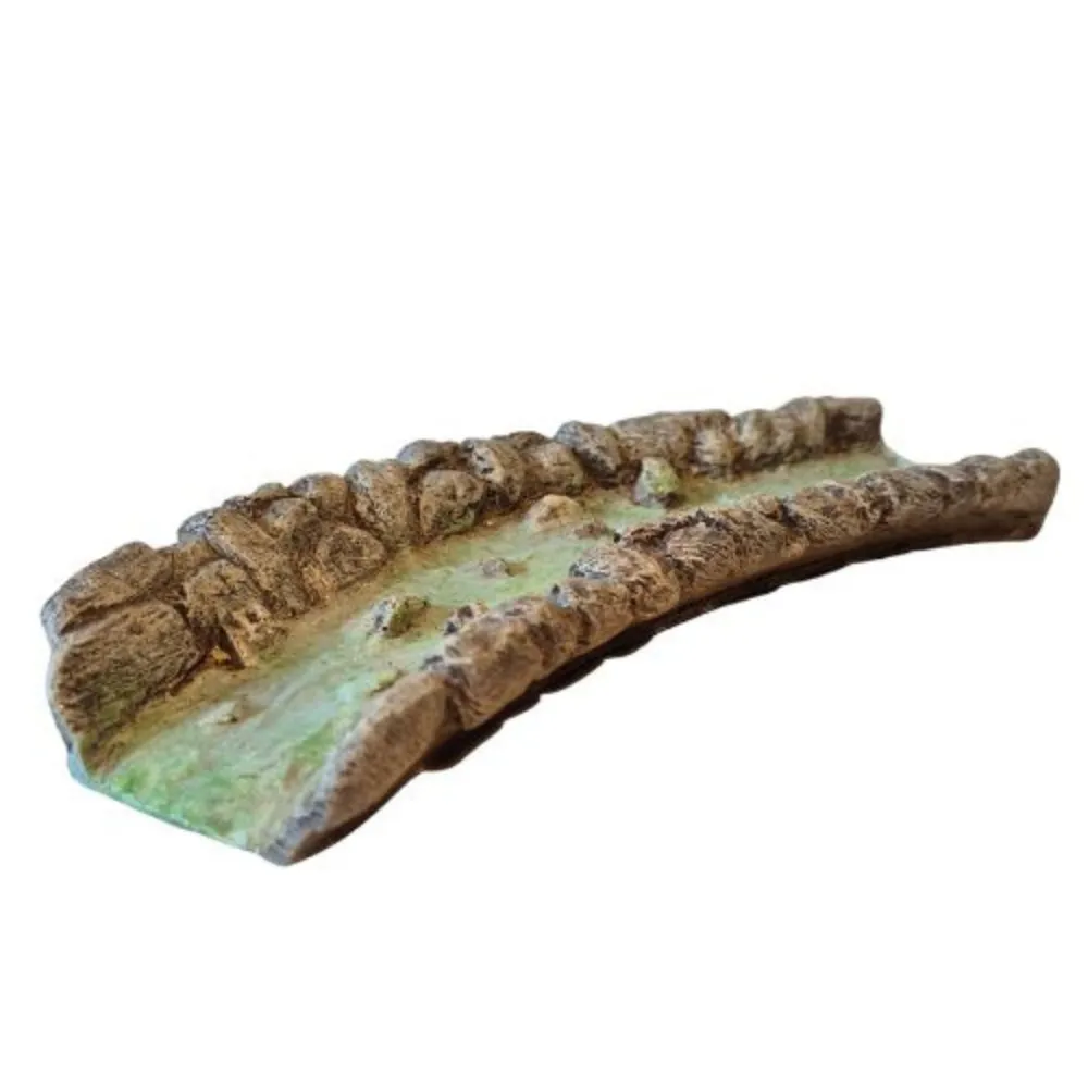 Modular Right-Curved River Section in Resin. This piece represents a miniature curved section of river, designed for scenic settings such as Nativity scenes, landscape dioramas, or naturalistic environments. The watercourse follows a gently sinuous path, set between two raised rocky banks modeled in relief to imitate the look of rough stone. The riverbed is rich in detail, with scattered stones and subtle greenish shades that suggest the presence of moss or algae along the flow. The natural coloration alternates tones of grey and brown for the rocks, while the riverbed features variations of green and light blue to simulate shallow, clear water. This river section is ideal for connecting with straight sections, sources, or ponds, helping to build a dynamic and realistic landscape.
