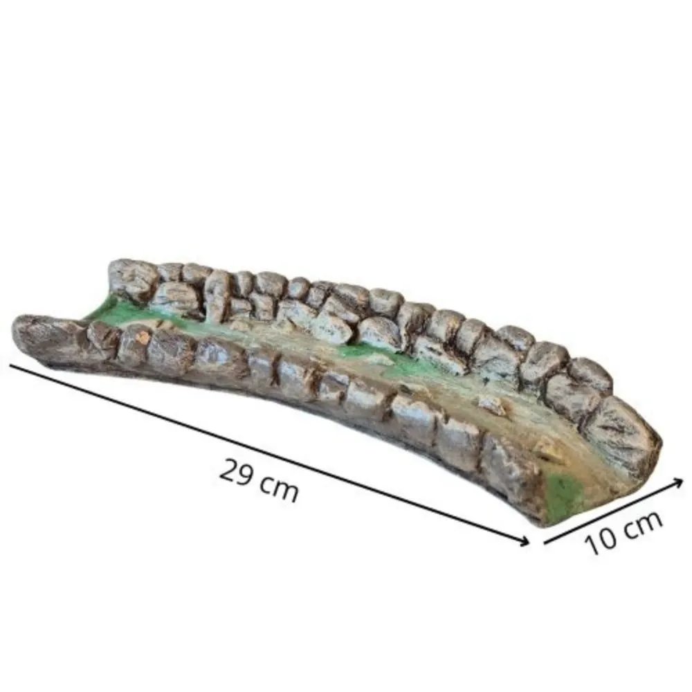 Modular Left-Curved River Section in Resin. This piece represents a miniature river section with a curved layout and a particularly natural appearance, designed for use in Nativity scenes or landscape settings. The river flows between two rock-effect banks, modeled with irregular reliefs that add depth and movement to the scene. The riverbed is scattered with stones and small raised details, featuring green and light blue shades that evoke water flowing over a rocky, moss-rich bed. The slightly irregular, curved shape of this section allows the direction of the watercourse to be varied within a larger composition, making the landscape less static and more realistic. It is an ideal element to combine with other modules such as sources, waterfalls, straight sections, and ponds, helping to create a well-structured and harmonious river scene.