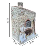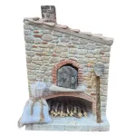 Rustic Polystyrene Oven for 20 cm Nativity Figures. This miniature oven, ideal for enhancing a rustic-style Nativity scene, is crafted with a faux masonry structure that faithfully reproduces the bricks and stones of traditional rural buildings. The red brick arch frames the oven opening, fitted with a small darkened door that suggests daily use and contact with ash. At the base, beneath the vault, there is a neatly stacked supply of firewood ready for lighting. Beside it, a baker’s peel leaning against the wall and a coarse fabric sack tied with string add an extra touch of realism, evoking the presence of a baker at work. Details such as the chimney on the pitched tiled roof and the subtle imperfections of the walls make this scenic piece especially valuable for those seeking a Nativity scene rich in life and authenticity.