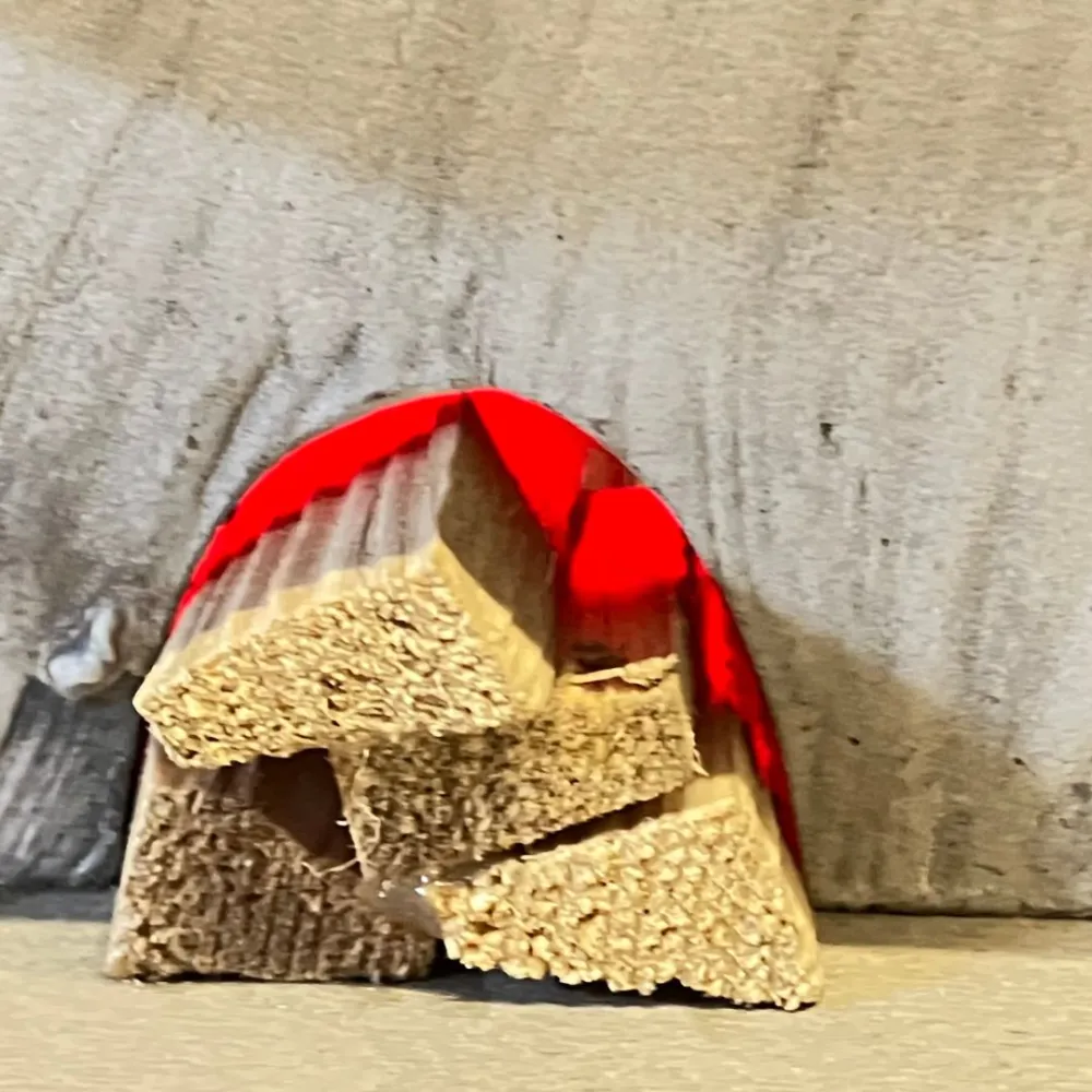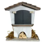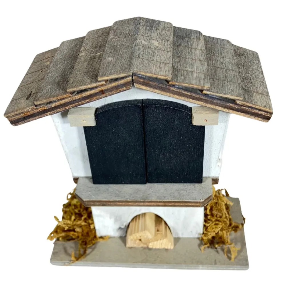 Miniature wooden oven with battery-powered LED, designed to be proportioned for 10–12 cm Nativity figures. This oven faithfully reproduces a traditional wood-fired oven in miniature form. The wooden base simulates stone or rustic plaster, with an irregular surface that recalls handcrafted masonry. The double-pitched roof, finished with small wooden tiles, is sloped to allow water runoff and protect the structure, echoing traditional construction styles. On the upper section, two black doors simulate the closures of ancient ovens. The firebox, featuring an arched opening, contains small miniature pieces of wood, enhanced by a red battery-powered LED light with on/off switch, which realistically simulates glowing embers. Moss applied at the base adds a further touch of realism. Perfect for Nativity scenes, dioramas, and historical settings, this miniature oven combines realistic materials and carefully crafted details to create an authentic and evocative effect.