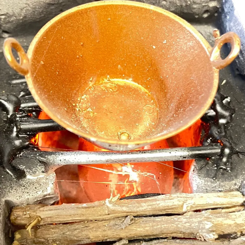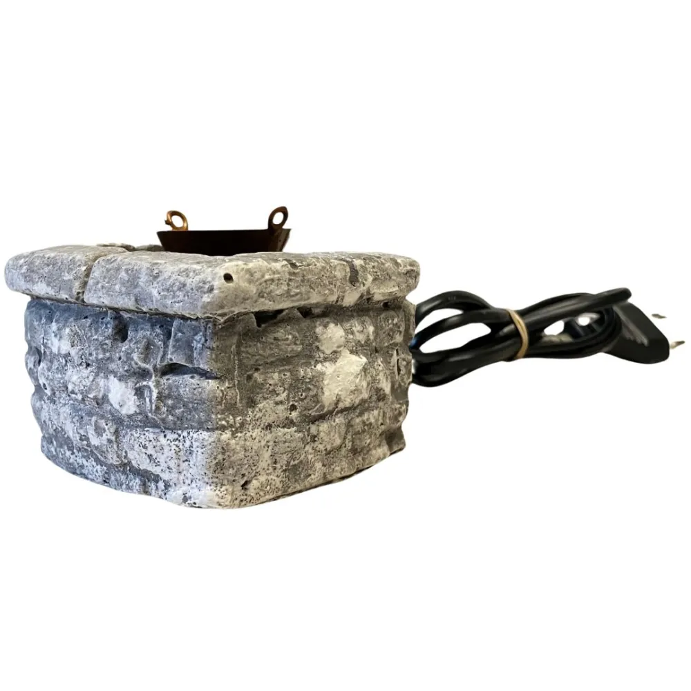 LCR PresepiMiniature plaster brazier with fire-effect lamp, designed to be proportioned for 10–12 cm Nativity figures. This is a high-quality handcrafted piece, made using natural materials and finished with meticulous attention to detail by LCR Presepi by Messi Leandro. The brazier is crafted from plaster worked to imitate rough stone, featuring an irregular texture and gray tones that enhance its realism. The structure, composed of stacked blocks, faithfully reproduces traditional masonry braziers. Inside, a black grill simulates wrought iron, topped with a miniature copper-colored pot with ring handles, typical of rural kitchens. The internal lighting recreates the glow of burning embers, adding depth and realism to the scene. Thanks to its refined details and realistic materials, this miniature is ideal for Nativity scenes and historical settings, evoking the atmosphere of ancient kitchens and artisan workshops.