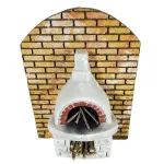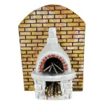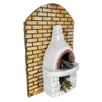 LCR PresepiMiniature plaster oven with flashing micro-lamp, designed to be proportioned for 12 cm Nativity figures. This is a high-quality handcrafted piece, made using natural materials and finished with meticulous attention to detail by LCR Presepi by Messi Leandro. The miniature oven features a solid faux-stone base and a domed structure that faithfully reproduces the plaster finish typical of traditional wood-fired ovens. The opening is framed by red bricks arranged in an arch, with dark joints for a realistic effect. The slender chimney recalls the original function of the oven, allowing smoke to escape naturally. Inside, small wooden twigs arranged in a radial pattern and a flashing micro-lamp simulate a lit fire, creating a warm and evocative effect. A lower arched compartment serves as a wood storage area, enriched with carefully placed logs. The slightly darkened work surface recalls the effect of heat on stone. Behind the oven, a wall finished in yellow-ochre faux bricks adds a rustic, time-worn character. Thanks to its accurate details and realistic materials, this miniature oven is perfect for Nativity scenes, historical dioramas, and rural settings, evoking the authentic charm of traditional country kitchens.
