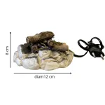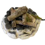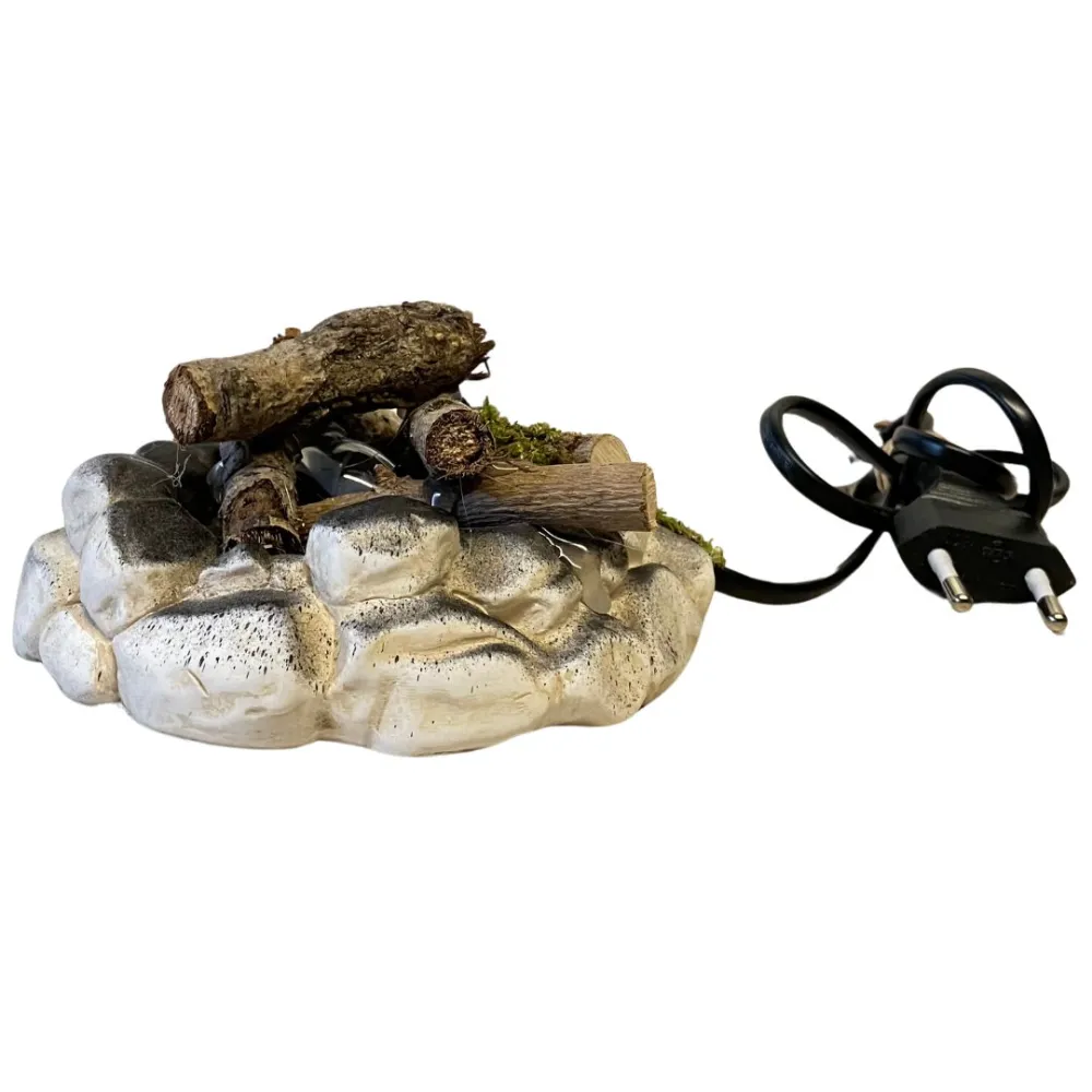 LCR PresepiMiniature campfire with faux stone and firewood, designed to be proportioned for 30 cm Nativity figures. This is a high-quality handcrafted piece, made using natural materials and finished with meticulous attention to detail by LCR Presepi by Messi Leandro. The base is composed of faux plaster stones painted in gray and black tones, giving a realistic, time-worn appearance as if darkened by heat and flames. On top, natural wooden logs are carefully arranged; some feature visible bark and irregular cuts, simulating freshly gathered firewood. To enhance realism, small tufts of moss have been added, evoking a natural, rustic setting. At the center of the hearth, a fire-effect lamp recreates the glow of burning embers, illuminating the logs with a warm light that simulates the typical shimmer of an active fire. This miniature reproduction is perfect for Nativity scenes, dioramas, and historical settings, adding authenticity to rural or medieval scenes. Its simple yet detailed design makes it a striking element for recreating cozy, realistic atmospheres.