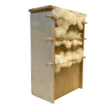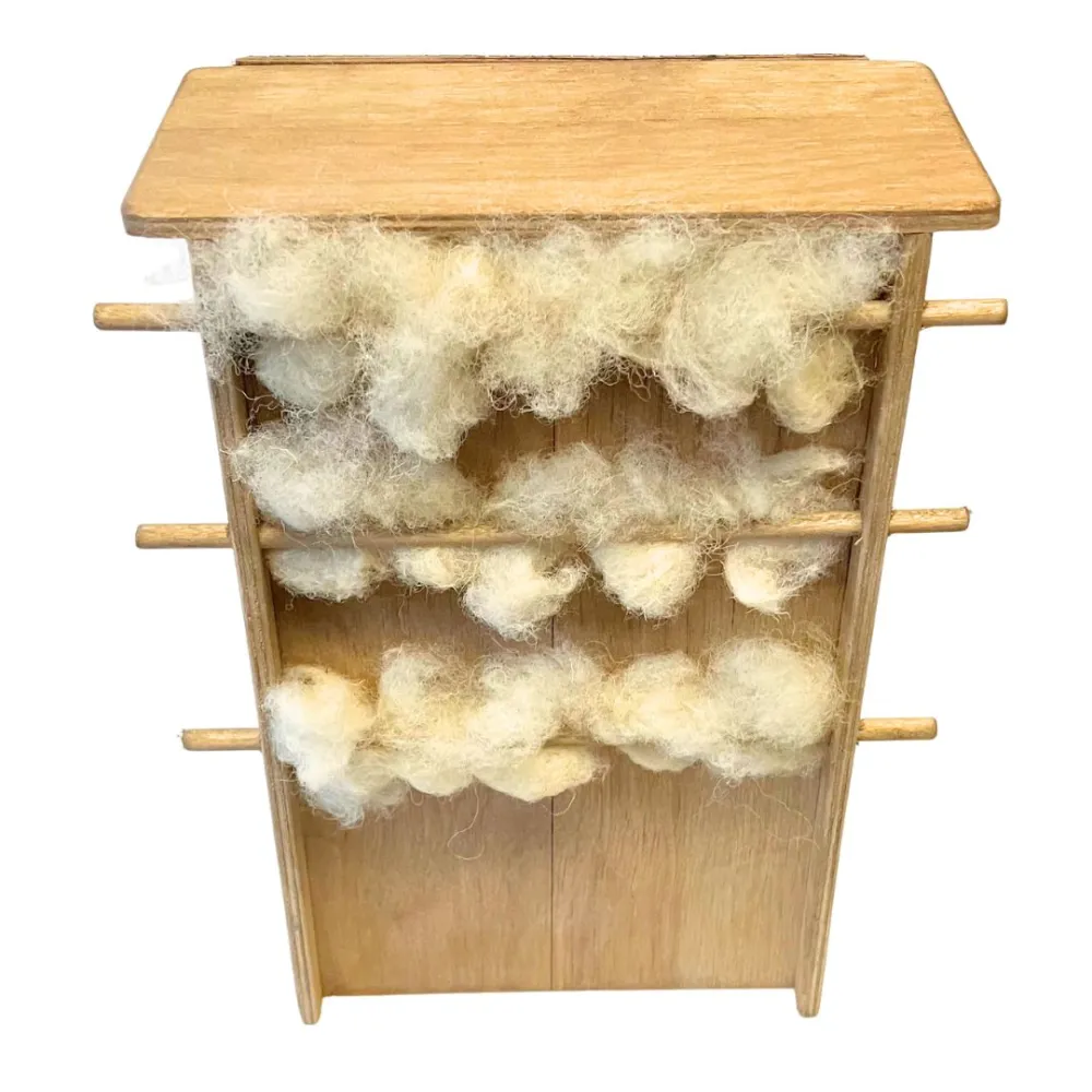 LCR PresepiCarded wool drying rack for 30 cm nativity figures. It is a handcrafted accessory made entirely of wood, depicting a drying rack for carded wool. The vertical structure consists of a base and two side panels supporting four horizontal rods. On these rods, tufts of raw carded wool are arranged to simulate the drying or airing phase of the textile material. Ideal for rural settings, artisan workshops, or domestic life scenes within the nativity display. A finely detailed piece, perfect for adding realism to scenes set in traditional countryside environments.