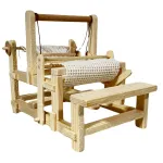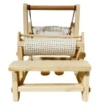 Miniature light wood loom, designed to be proportionate to 12 cm nativity figures. The wooden structure includes a solid rectangular base supporting the essential components, among which the movable reed is fundamental for aligning the warp threads and ensuring an even weave. The two cylindrical rollers, positioned at the front and rear, allow the fabric to advance, simulating the weaving process. A side lever helps regulate the fabric tension, while small details such as pins and joints enhance the model’s realism. Complete with an integrated bench for the operator, allowing a comfortable seated position while working on the fabric, this miniature loom is perfect for recreating artisan workshops, rural scenes, and historical settings in nativity displays and dioramas.