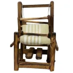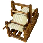 Wooden loom for 10 cm nativity figures. It is a high-quality handcrafted piece, made and carefully finished in every detail by a local artisan for LCR Presepi by Leandro Messi. The structure is composed of dark brown wooden uprights and crossbeams, with an aged finish that enhances the natural grain of the material. The loom features a working mechanism with cylindrical rollers wrapped with a light striped fabric strip, simulating the weaving process in progress. The movable reed and foot pedals at the base faithfully reproduce the traditional operation of a real loom. This miniature piece is ideal for nativity scenes, historical dioramas, and settings dedicated to ancient crafts, adding authenticity and charm to traditional displays.