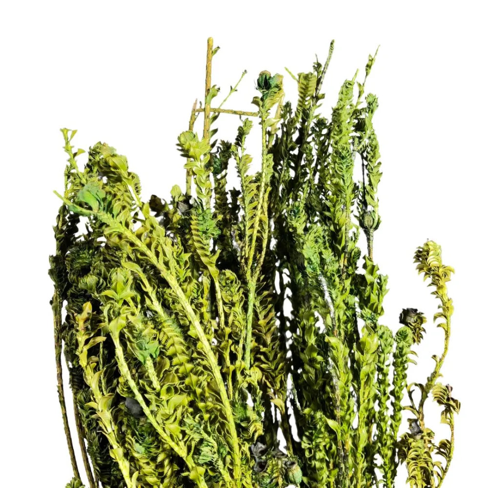 Olive-green amarelo bundle, 200 g. This dried plant features thin, elongated stems with dense clusters of small spike-like inflorescences. Its natural green color and slender structure make it ideal for floral arrangements, handcrafted decorations, and miniature scenic displays. Perfect for enriching rustic settings or scaled landscapes, it adds a realistic and harmonious touch thanks to its refined texture and versatility.