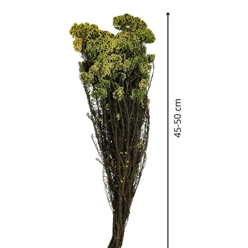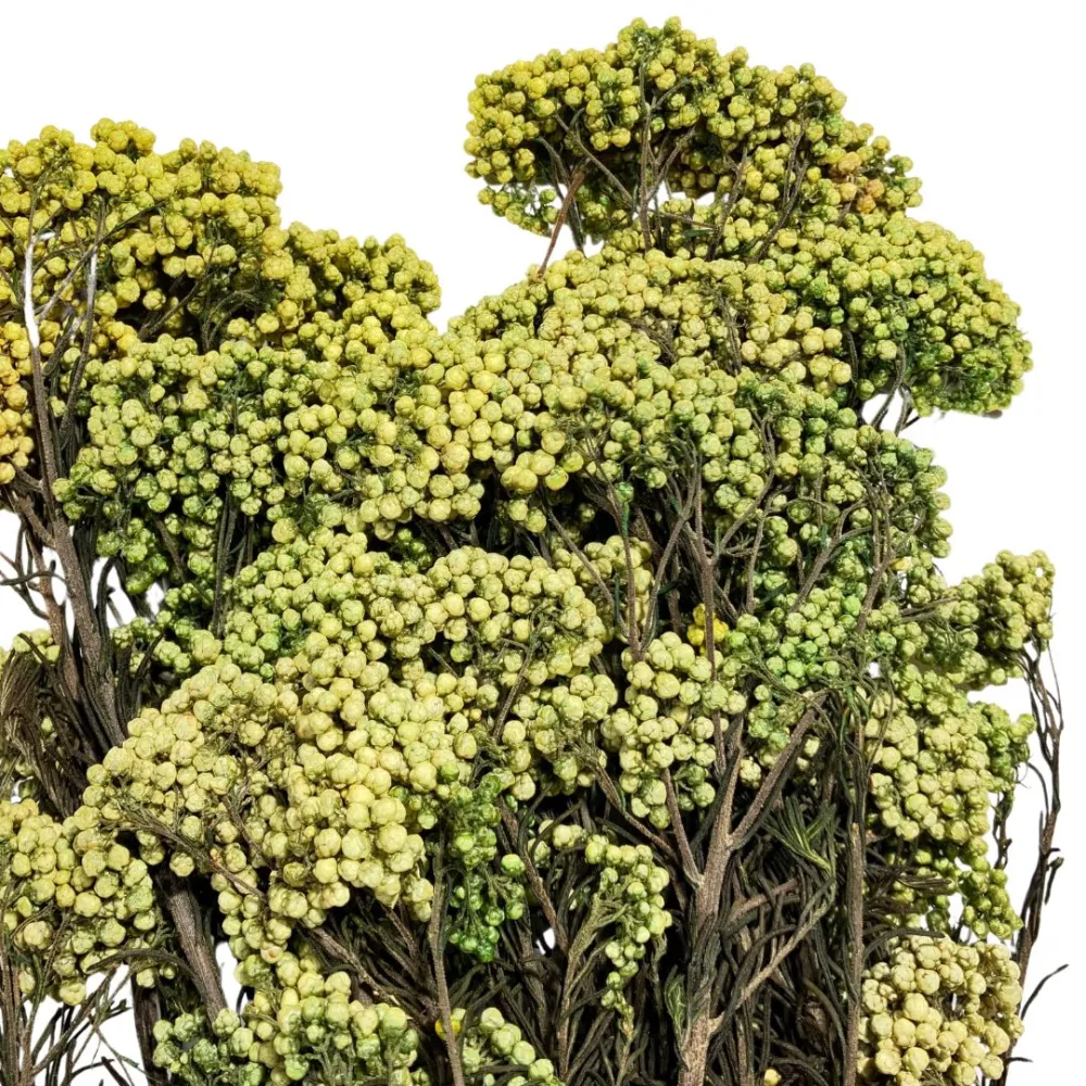 Riso – Helichrysum diosmi bundle, 100 g. This dried plant features compact, rounded inflorescences in a greenish-yellow color. Its dense structure and small flowers give it a refined, decorative appearance, making it ideal for floral arrangements, miniature scenic displays, and handcrafted decorations. Thanks to its durability and detailed texture, it is perfect for creating natural and realistic environments.