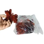 Red stabilized lichen, 500 g, packaged in a transparent bag. It features a branched structure and a vivid color that makes it an excellent choice for creative decorations. Thanks to its flexibility, it can be easily shaped to suit a wide variety of uses.