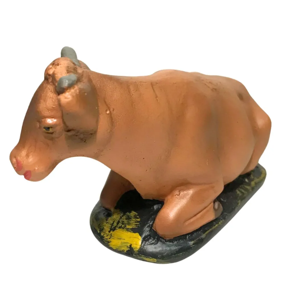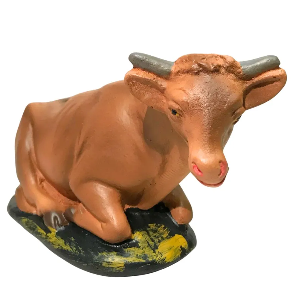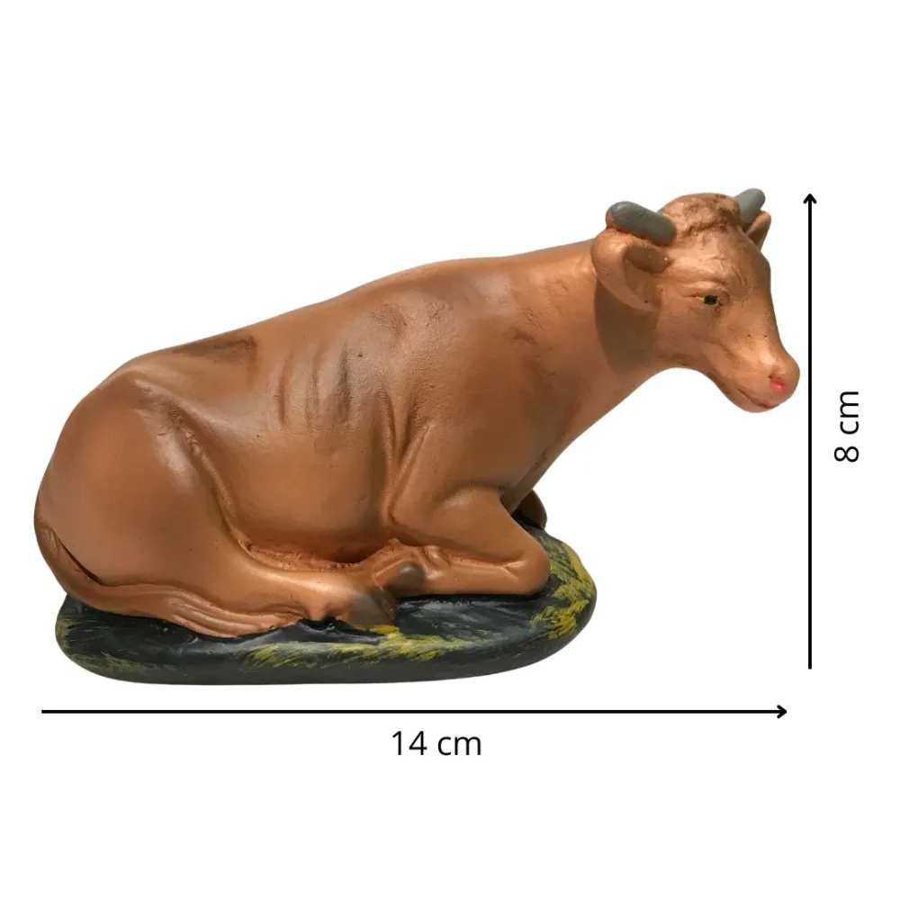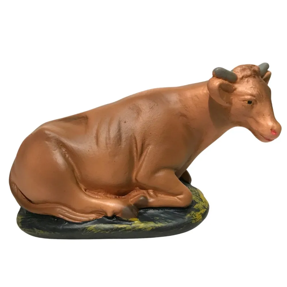 Statua in gesso della serie 15 cm raffigurante un bue accucciato. E' un'opera di alta qualità, realizzata e curata nei minimi dettagli dall'eccellenza dell'arte toscana. La realizzazione avviene con metodi artigianali, partendo dalla colata del gesso fino alla decorazione a pennello, seguendo tecniche tradizionali tramandate da tre generazioni. Il soggetto è dipinto a mano con tonalità naturali di marrone e dettagli sulle corna, sulle orecchie e sul muso. La posa dell’animale, disteso in atteggiamento tranquillo, trasmette un senso di calma e protezione. La base, decorata con sfumature che richiamano l’erba e il terreno, contribuisce a integrarlo perfettamente nella scena della Natività.