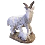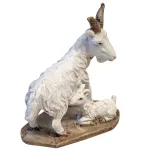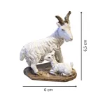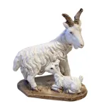 Goat with Kid in Resin – for 10–12 cm Nativity Figures This resin figure depicts an adult goat accompanied by her kid, suitable for Nativity scenes with figures measuring 10–12 cm. The scene captures a natural moment of protection and closeness, with the young kid shown nursing beside its mother. The surfaces are finely sculpted: the coat features subtle incisions that realistically reproduce the texture of fur, while the horns and muzzle are enhanced with delicate color shading. The single integrated base ensures stability and makes placement within the scene easy and secure. Ideal for pasture settings, rural landscapes, or countryside corners of the Nativity, this figure adds warmth and realism, enriching the scene with a lifelike depiction of everyday rural life.
