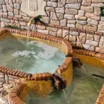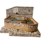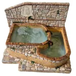 Double-basin resin fountain for 12–15 cm Nativity figures. This rustic-style fountain is designed for settings such as Nativity scenes or dioramas. The structure is made with materials that imitate stone and brick, giving it a traditional and realistic appearance. In the background stands a stone wall, at the center of which is a decorative relief with a crest; from this element, a small stream of water flows thanks to a recirculating pump that feeds the fountain. The fountain consists of two main basins—an upper and a lower one—connected by a small channel that allows the water to flow naturally between them. The basins are bordered by stone walls with a top edge finished in red bricks, giving the structure a neat and carefully crafted look. The base is designed to resemble rustic paving, with irregular stones that evoke an aged surface. The color palette, featuring shades of ochre, gray, and terracotta, is enhanced by small green accents that simulate moss or spontaneous vegetation. Overall, it recalls the atmosphere of an ancient village or rural scene, making it a perfect addition to a traditional Nativity display.