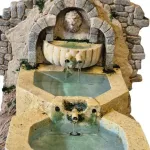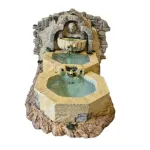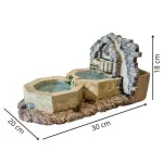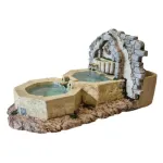 Hexagonal triple-basin resin fountain for 12–15 cm Nativity figures. This rustic-style fountain is ideal for Nativity scenes and miniature settings. The structure is composed of three cascading levels: at the top is a semicircular basin set within a stone arch, from which water flows in two streams into the central octagonal basin. From there, a further jet carries the water down into the lower basin, also octagonal and slightly larger. The entire piece is crafted from materials that realistically imitate stone and rock, enhanced with details such as artificial moss that increase the overall realism of the scene. Water flows continuously thanks to a concealed recirculating pump housed within the structure, ensuring a constant and natural effect without the need for a direct water supply connection. The overall appearance recalls an ancient fountain set in a mountain village or rural hamlet, making it perfect for adding life and movement to a handcrafted Nativity display.