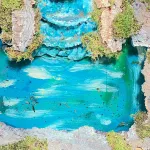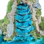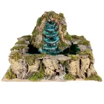 Miniature cork stream with lake, designed to be proportionate to 30 cm Nativity figures. This high-quality handcrafted piece is created and finished with meticulous attention to detail by a Tuscan artisan for LCR Presepi by Messi Leandro. It features a stepped structure that allows the water to flow gradually downward, creating a realistic multi-level effect. The wide lower basin is designed to collect the water and ensure continuous recirculation. Made from cork, the structure realistically imitates rock formations and natural waterfall vegetation. The water surface is painted in an intense blue tone to simulate depth and reflections, while moss applied along the edges adds a natural, time-worn appearance. The piece is equipped with a pump that allows water to flow from the top of the stream and cascade through the various levels, creating continuous and lifelike movement.