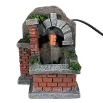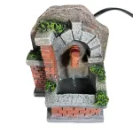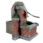 Miniature faux brick resin fountain designed to be proportioned for 8–10 cm Nativity figures. The structure is crafted in molded resin to simulate red bricks and aged stone. On the fountain wall, just above the spout, there is a faux stone arch with a detailed finish that recalls ancient masonry fountains. A continuous flow of water pours from the copper-colored spout and collects in the lower basin with a stone-edged rim. Decorative green moss elements are applied on the stones and within the crevices, creating a natural damp effect. Thanks to a recirculating pump, water flows continuously from the spout and falls into the basin below. This miniature fountain in faux stone and brick is a detailed and realistic decorative element. The aged design, decorative moss, and authentic water flow make it ideal for Nativity scenes, dioramas, or settings inspired by ancient and rural environments.