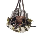 LCR PresepiBoiling-effect cauldron with fire-effect lamp, miniature version, designed to be proportionate to 20–30 cm Nativity figures. This high-quality handcrafted piece is made using natural materials and finished with great attention to detail by LCR Presepi by Messi Leandro. The cauldron, crafted in hammered-finish copper, features an authentic artisanal look that recalls traditional cooking tools of the past. Inside, the water appears to boil thanks to a sophisticated bubbling effect created by an aerator, producing realistic movement. The cauldron is suspended by a metal chain securely fixed to a sturdy wooden tripod, a structure traditionally used for outdoor cooking. Beneath it, the flame is skillfully simulated by a lamp that reproduces the effect of glowing embers, casting a warm and vibrant light. Small branches and moss decorate the base, enriching the scene with natural details. The faux-stone walls, finished with an aged effect, evoke ancient outdoor hearths and rustic village kitchens. This miniature reproduction is perfect for Nativity scenes, historical dioramas, and themed displays, adding realism and charm through its refined craftsmanship and the use of authentic materials.