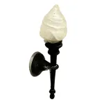 Wall torch with red light, 12 volts, 3D-printed miniature, designed for 15–20 cm Nativity figures. The torch is mounted on a circular black base, intended for attachment to a wall or vertical surface. From the base extends a long, slightly tapered stem with decorative details that give it an antique, refined appearance. The upper section features a translucent flame-shaped cover, evoking the look of traditional oil torches used in castles and medieval streets, adding a touch of authenticity to the scene. Inside, a small bulb emits a warm red light that shines through the translucent flame, realistically simulating the effect of a burning torch. The illumination is soft and even, creating a cozy, atmospheric glow without glare. This red wall torch is a finely detailed accessory, ideal for historical and fantasy-style settings. Its combination of realistic materials and gentle lighting makes it perfect for Nativity scenes, dioramas, and model displays. Compatible power supplies are sold separately under product codes EFGT01, EFTG02, and EFTG03.