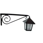 Copper wall lantern with warm yellow light, 12 volts, miniature, designed to be proportionate to 20 cm Nativity figures. This finely detailed lantern is mounted on a black metal arm with elegant scrolls and wrought-iron-style decorations, giving it a refined and vintage appearance. The structure, finished in matte black, features a square, clean-lined design inspired by traditional street lanterns. The semi-transparent side panels allow the inner light to diffuse softly and evenly, creating a natural glow without glare. The upper section is topped with an angled, pyramid-shaped roof reminiscent of historical lanterns used for public lighting. Inside, a small bulb emits a gentle yellow light, producing a realistic and atmospheric effect. With its classic design, translucent “glass” effect, and warm illumination, this miniature wall lantern is a beautifully crafted and realistic accessory — perfect for recreating evocative scenes in Nativity settings and dioramas. Compatible power supplies (sold separately): product codes EFGT01, EFTG02, and EFTG03.