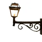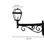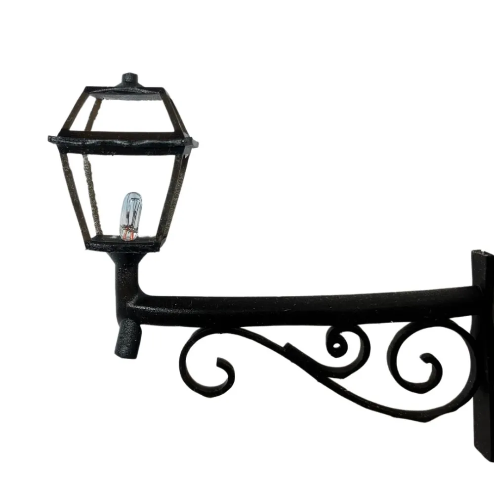 Wall lantern with warm yellow light, 12 volts, 3D-printed miniature, designed to be proportionate to 30 cm Nativity figures. This elegant wall lantern features a horizontally extended arm adorned with graceful curved details reminiscent of traditional wrought-iron craftsmanship. The arm, anchored to a sturdy mounting base, allows for easy installation on walls or other vertical surfaces. Made in matte black material, the lantern showcases a timeless design inspired by vintage urban lighting. The sides are crafted from translucent panels that protect the bulb and ensure an even diffusion of light. The open-top design adds authenticity, recalling classic gas lanterns once used in historic towns. Inside, a small bulb emits a soft yellow glow, producing a warm, realistic atmosphere. The translucent panels diffuse the light gently, avoiding glare while maintaining visual charm. With its refined design, realistic finish, and warm illumination, this miniature wall lantern is a perfect decorative accessory for Nativity scenes and dioramas. It beautifully evokes the charm of old city streets, squares, and inns from bygone eras. Compatible power supplies (sold separately): product codes EFGT01, EFTG02, and EFTG03.