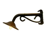 Antique-style copper wall lamp with warm yellow light, 12 volts, miniature, designed to be proportionate to 20 cm Nativity figures. This finely crafted lamp features a curved black metal arm adorned with ornamental scrollwork reminiscent of wrought-iron designs. The structure is attached to a wall-mounted base, making it easy to position on vertical surfaces or building façades. The circular, downward-tilted shade protects the bulb and softly diffuses the light, creating a warm, natural glow. Beneath the lampshade sits a small warm-light bulb that enhances the atmosphere with an authentic vintage touch. This antique-style wall lamp is a refined and realistic decorative element, perfect for Nativity scenes and dioramas. Its detailed structure, elegant design, and gentle illumination make it ideal for recreating the lighting of old streets, village squares, and rustic inns. Compatible power supplies (sold separately): product codes EFGT01, EFTG02, and EFTG03.