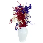 Tall PVC vase with flowers, in miniature, designed to be proportionate to 15–20 cm Nativity figures. The vase features an elegant, elongated shape with a structure reminiscent of classical amphorae, yet softened by more modern, flowing lines. The base is slightly widened for stability, then narrows gradually toward the center, creating a slender profile. From there, the form expands again into a rounded shoulder that provides visual balance and harmony. The neck is narrow and elongated, with a slight outward flare that ends in a wider, rounded rim. The surface is smooth, glossy, and white, with no decorations or visible patterns. Inside the vase is an arrangement of dried or artificial flowers made of delicate, slender branches with small petals. The dominant flower colors are red, blue, and white, intertwined in a harmonious composition. The red is more concentrated at the center, the blue spreads mainly along the sides, and the white blends throughout, adding a light and contrasting touch. The overall effect is refined and decorative, with a slightly wild, natural appearance thanks to the loosely structured branches. With its elegant form and detailed floral arrangement, this vase is an ideal decorative complement for Nativity scenes, dioramas, dollhouses, model-making projects, and collectibles.