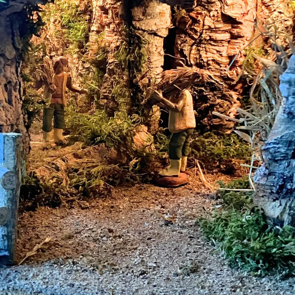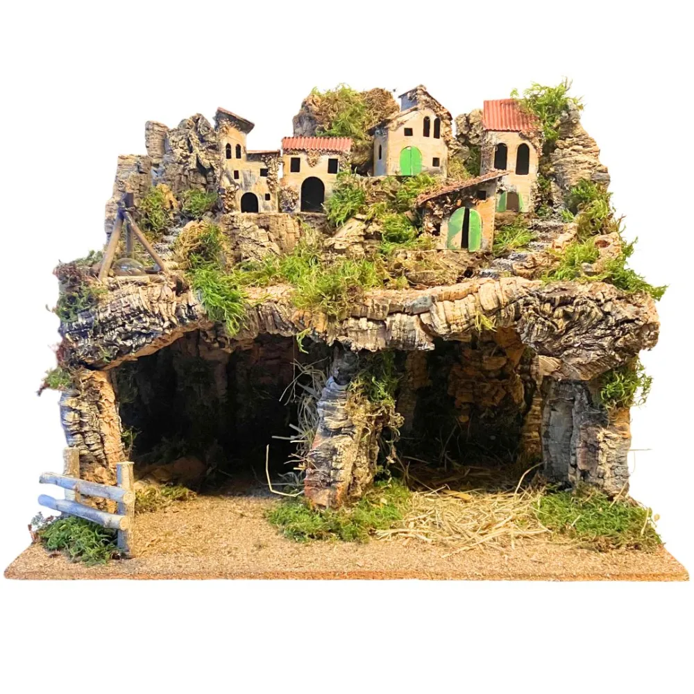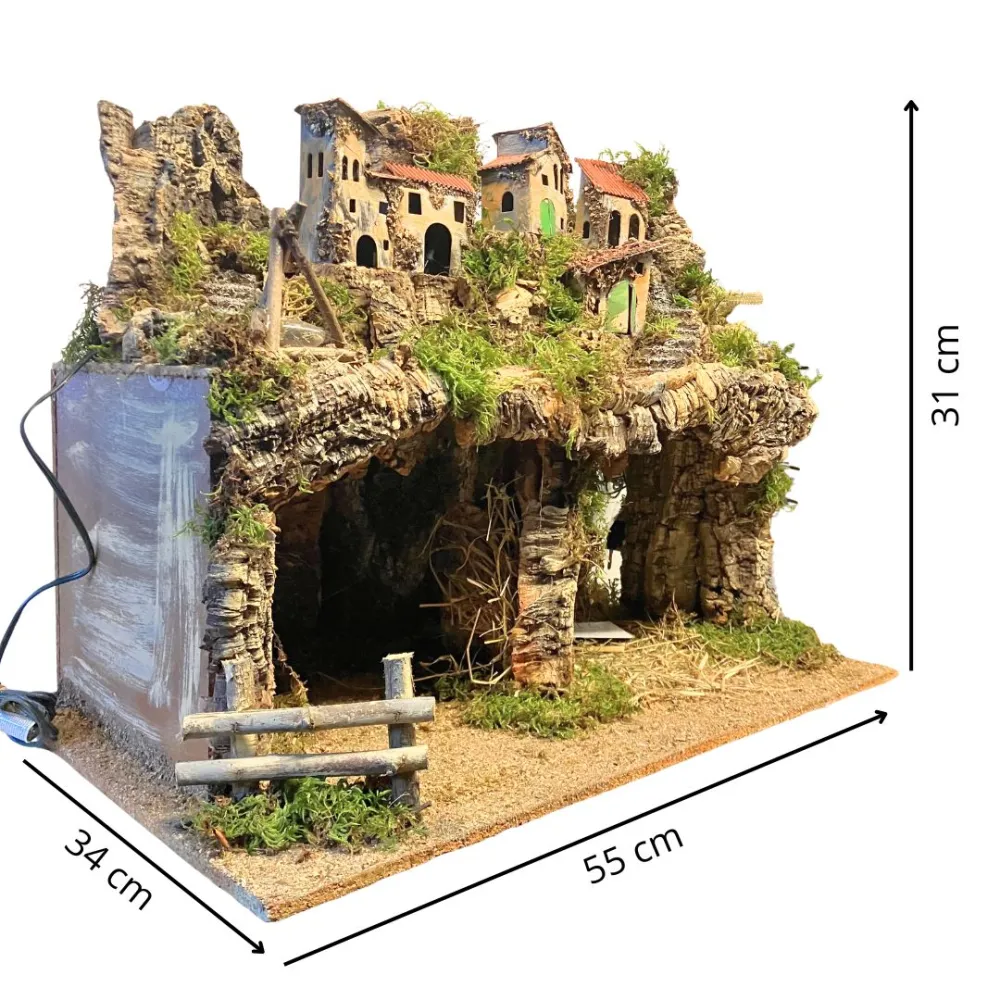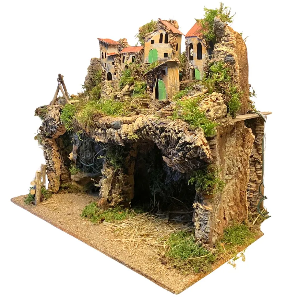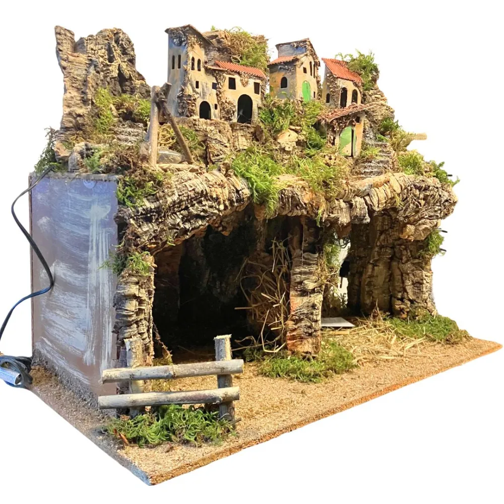 Scenografia per presepe artigianale raffigurante un borgo, realizzato in legno e sughero, completo di luci e fuoco, con doppia grotta alla base, ideale per ospitare una Natività da 12 cm. All’interno di una delle grotte è inserito uno specchio, pensato per creare un suggestivo effetto di profondità e ampliare la prospettiva della scena. Un borgo artigianale per dare vita a un presepe autentico e pieno di atmosfera.