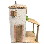 Scenic polystyrene structure, designed for nativity scenes with 10 cm nativity figures, depicting a small rustic house with a side covered porch. The building features aged plaster-effect walls, a wooden door framed with brick-effect details, windows with shutters, and a traditional tiled roof with chimney, elements that recall the simple architecture of traditional village homes. On the side, a wooden portico supported by pillars creates a small sheltered area with a paved floor. The structure is ideal for staging everyday life scenes within the nativity display, such as homes, small workshops, or village corners.