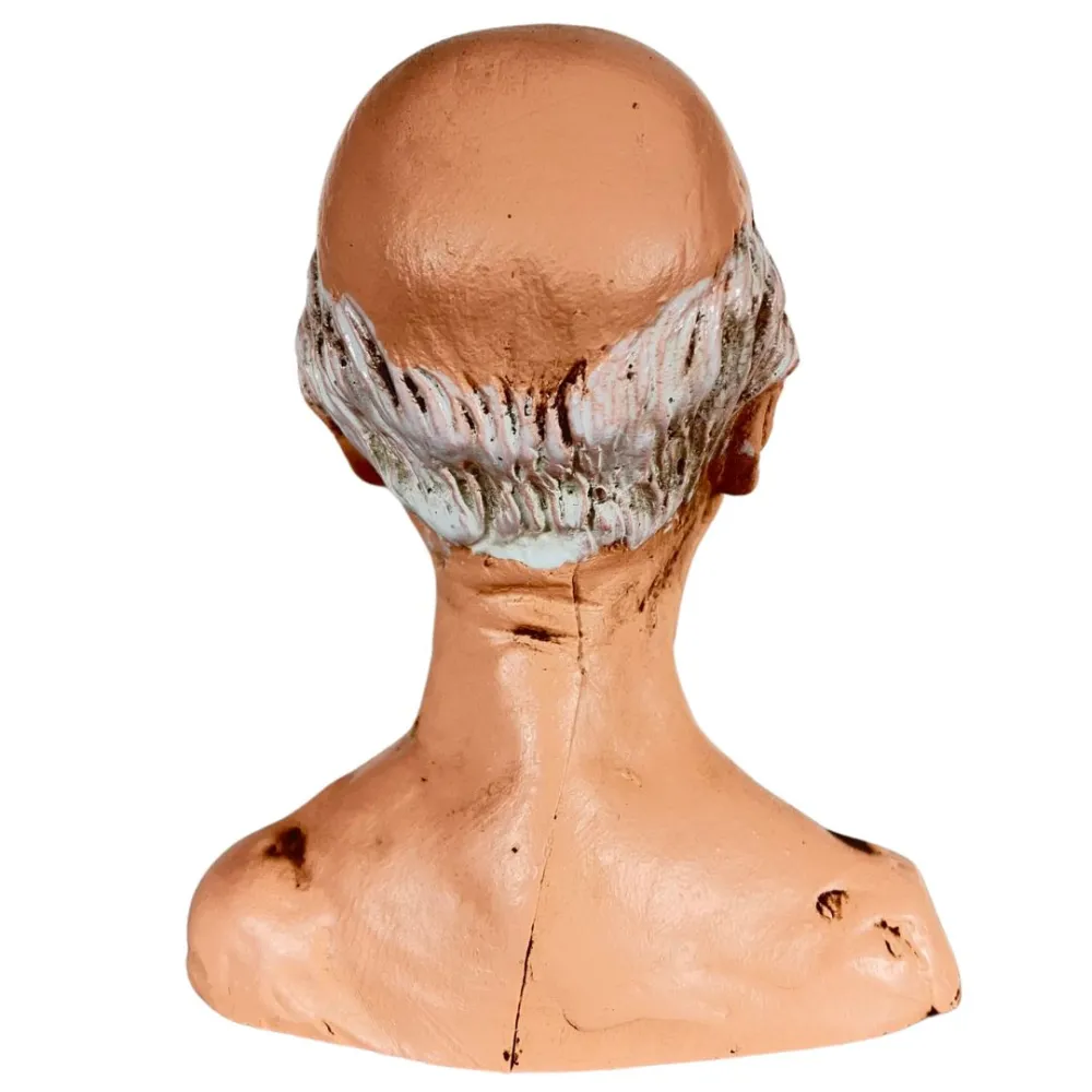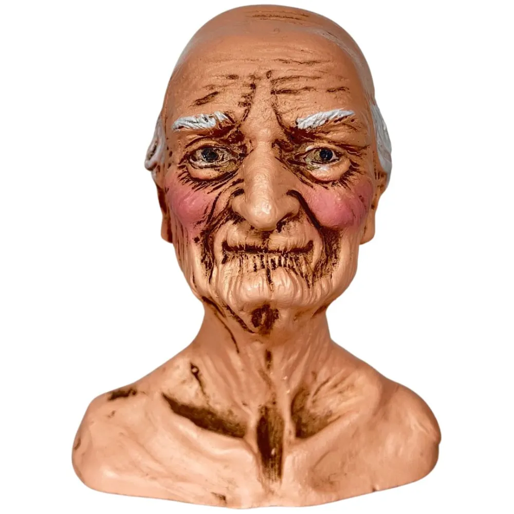 LCR PresepiResin Elderly Man Head for 30 cm Nativity Figures. This resin piece is designed for creating a DIY Nativity figure. The model was crafted by local artist Michela Nibaldi, exclusively for LCR Presepi by Messi Leandro. The head portrays an elderly man, sculpted with great care and attention to detail. His facial features are clearly marked by the passage of time, with numerous wrinkles crossing the skin and giving depth and character to the expression. The figure is clean-shaven, with short light-grey hair finely detailed with subtle lines that enhance its natural texture. The eyes are deep and vivid, adding a strong sense of realism to the sculpture. The overall expression conveys wisdom, calm, and reflection, making this head ideal for those seeking a character that evokes life experience, serenity, and quiet dignity within a Nativity scene.
