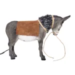 Standing donkey in resin, proportioned for nativity scenes with 30 cm nativity figures, distinguished by fine craftsmanship and realistic detailing. The animal features a vertical head movement, gently raising and lowering in a slow, natural motion. The model was created by local artist Michela Nibaldi, exclusively for LCR Presepi by Messi Leandro, while the movement mechanism was personally developed by Messi Leandro. The coat is carefully finished with realistic color rendering, and the blanket draped over the back together with the applied rope complete the rustic appearance. Ideal for stable settings, traveling scenes, or resting areas, this animated figure adds dynamism and authenticity to the entire nativity scene.
