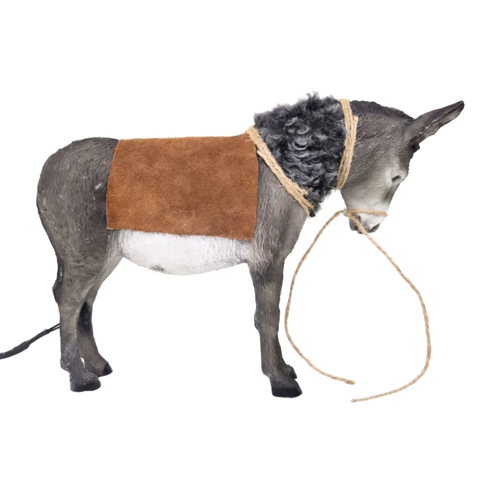 LCR PresepiStanding donkey in resin, proportioned for nativity scenes with 30 cm nativity figures, distinguished by fine craftsmanship and realistic detailing. The animal features a vertical head movement, gently raising and lowering in a slow, natural motion. The model was created by local artist Michela Nibaldi, exclusively for LCR Presepi by Messi Leandro, while the movement mechanism was personally developed by Messi Leandro.