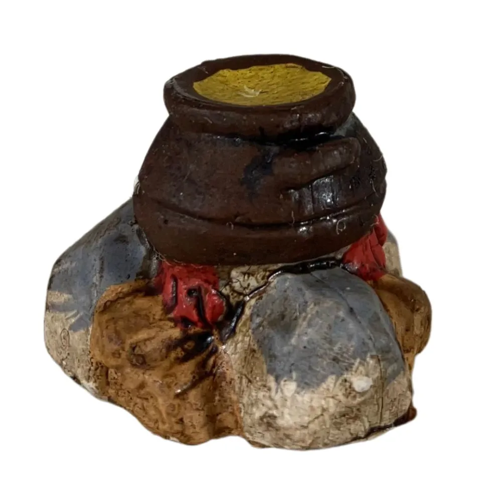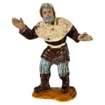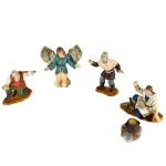OliverAnnunciation Set – Oliver, 5 cm Series. This set depicts the scene of the Annunciation, rendered in a lively and expressive style. Each figure features dynamic poses and colorful garments that recall everyday life of the past. At the center stands an angel with golden wings and a green-blue robe, a serene expression on his face and arms open in a gesture of announcement. To his left, an elderly man kneels, with gray hair and dressed in a white shirt, red jacket, and green trousers, gazing on in wonder. To the right, a standing man in a beige tunic and dark trousers wears a surprised expression, his beard accentuating his features. In the lower right corner, another man sits beside a fire, cooking in a small pot. The scene captures a moment of simple daily life suddenly interrupted by the angel’s appearance, evoking awe and the evocative atmosphere of the Italian Nativity tradition.