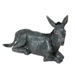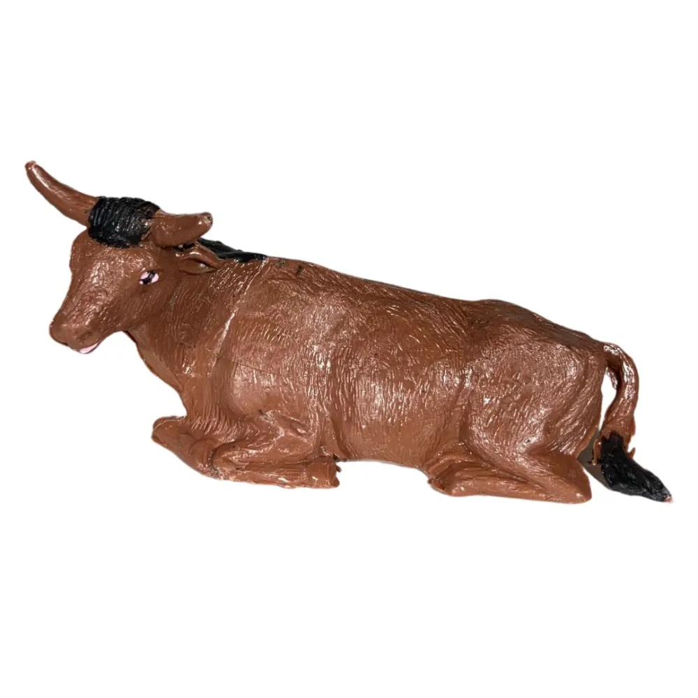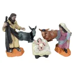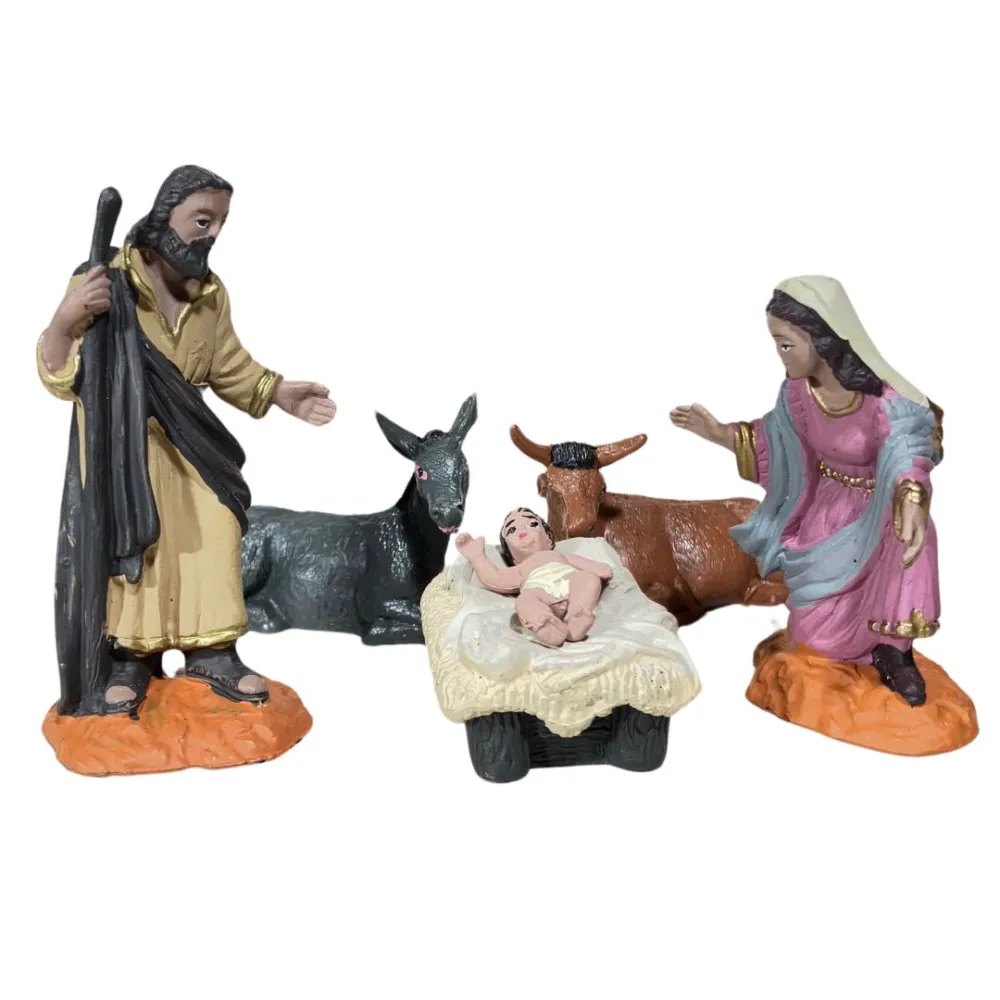 OliverNativity Set – Five Pieces, Oliver, 8 cm. This scene depicts the Holy Family at the heart of the Nativity. At the center lies Baby Jesus, resting in a padded manger covered with a light cloth. His serene expression and raised arms form a symbolic gesture of welcome and blessing. To His right stands Saint Joseph, holding a staff in his left hand. He wears a yellow tunic with a dark mantle and displays a protective attitude, his gaze tenderly directed toward the Child. To the left, Mary kneels with her head covered by a light veil. She is dressed in a pink robe with golden details and a light blue mantle, reaching gently toward Jesus with one outstretched hand in a gesture of tenderness and adoration. Behind the manger are the two symbolic animals of the Nativity, the ox and the donkey, observing the scene in silence. The brown ox and the dark gray donkey are shown lying down, symbolizing the humility and simplicity of the place where Jesus was born. The overall composition conveys a strong sense of peace, family love, and spirituality, perfectly reflecting the profound meaning of the Nativity.