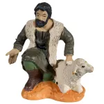 OliverAdoring Shepherd with Lamb – Oliver, 8 cm. This Nativity figure depicts a kneeling shepherd with a lamb, one of the most iconic and symbolic characters of the traditional Nativity scene. The man, with dark beard and black hair, has a serene expression and his gaze directed toward the Nativity, as if in an act of adoration. He wears a dark green garment with green trousers and brown boots, completed by a light-colored coarse wool vest typical of shepherd attire. The figure is shown kneeling, with one hand extended in a gesture of offering or greeting, while the other rests gently on a white lamb, a symbol of purity and sacrifice. This figure conveys humility, devotion, and simplicity—values deeply connected to the message of the Nativity. The kneeling shepherd represents an open heart bowing before the mystery of the birth of Jesus, bringing with him the most precious gift of all: his faith.