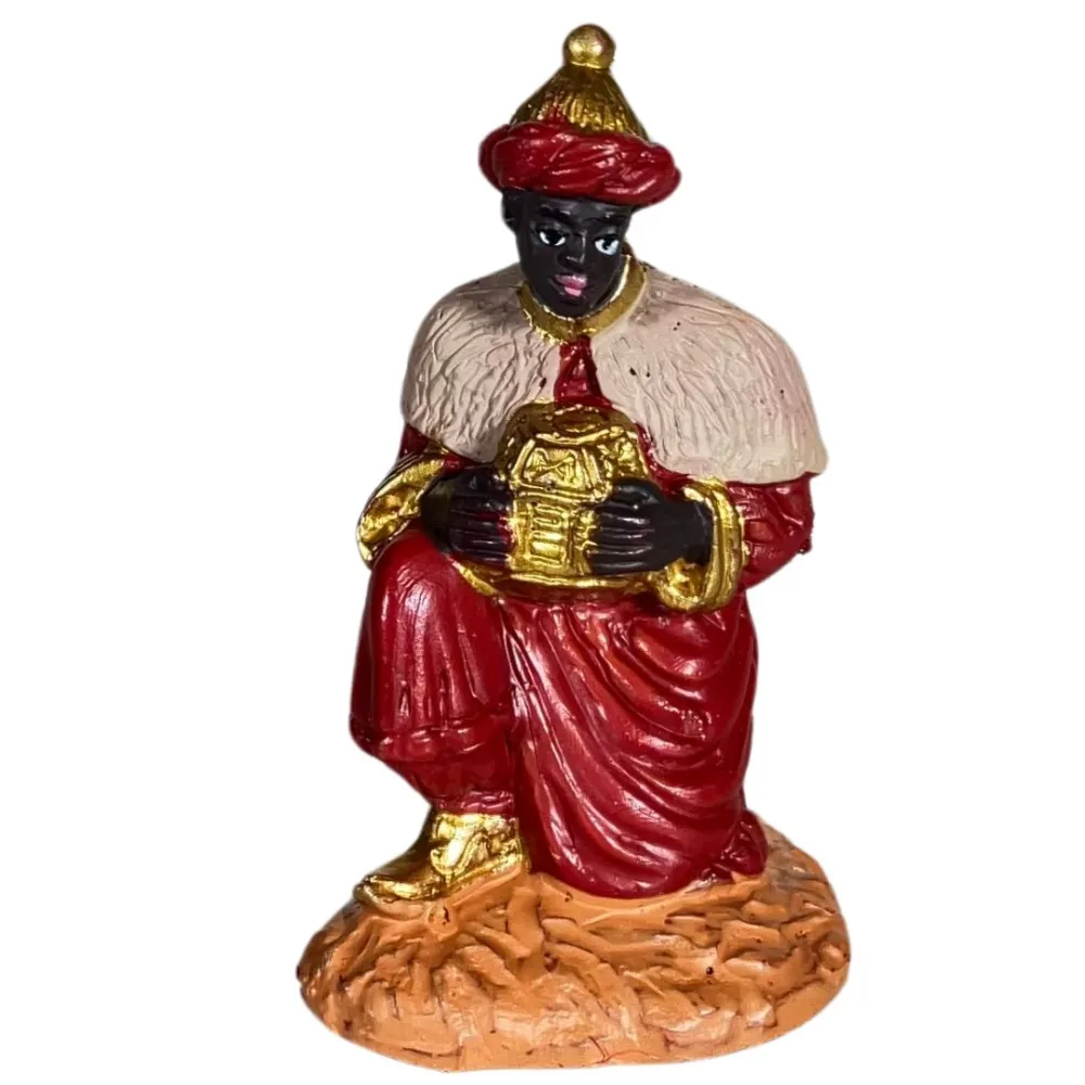OliverWise Man with Myrrh – Oliver, 8 cm. This figure represents one of the Wise Men, shown kneeling in a gesture of homage and reverence. He wears a red robe enriched with golden details and a light-colored mantle draped over his shoulders. His ornate golden headdress emphasizes his royal status. In his hands, he holds a precious golden container filled with myrrh, the gift symbolizing suffering and sacrifice, foreshadowing the destiny of Christ. The devout pose and richly detailed attire highlight the solemnity and deep respect of this sacred moment.