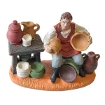 PVC pottery seller, 8 cm, depicted seated beside his goods while holding two vessels in his hands. The scene includes several pots and jugs arranged on a small table and on the ground, creating a small artisan shop. The composition is rich in detail, with varied shapes and colors that make the scene realistic and harmonious. Ideal for enriching market settings or everyday life scenes within the nativity scene.
