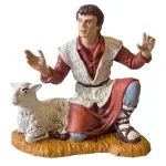 PVC kneeling shepherd with sheep, 15 cm, depicted beside the animal with raised hands in a gesture of devotion. The figure is shown in a kneeling position, with a natural posture that recalls pastoral scenes and the care of the flock. The details of the sheep and the fully painted clothing make the composition realistic and harmonious. Ideal for placement within the Nativity scene, helping to create an atmosphere of reflection and spirituality.