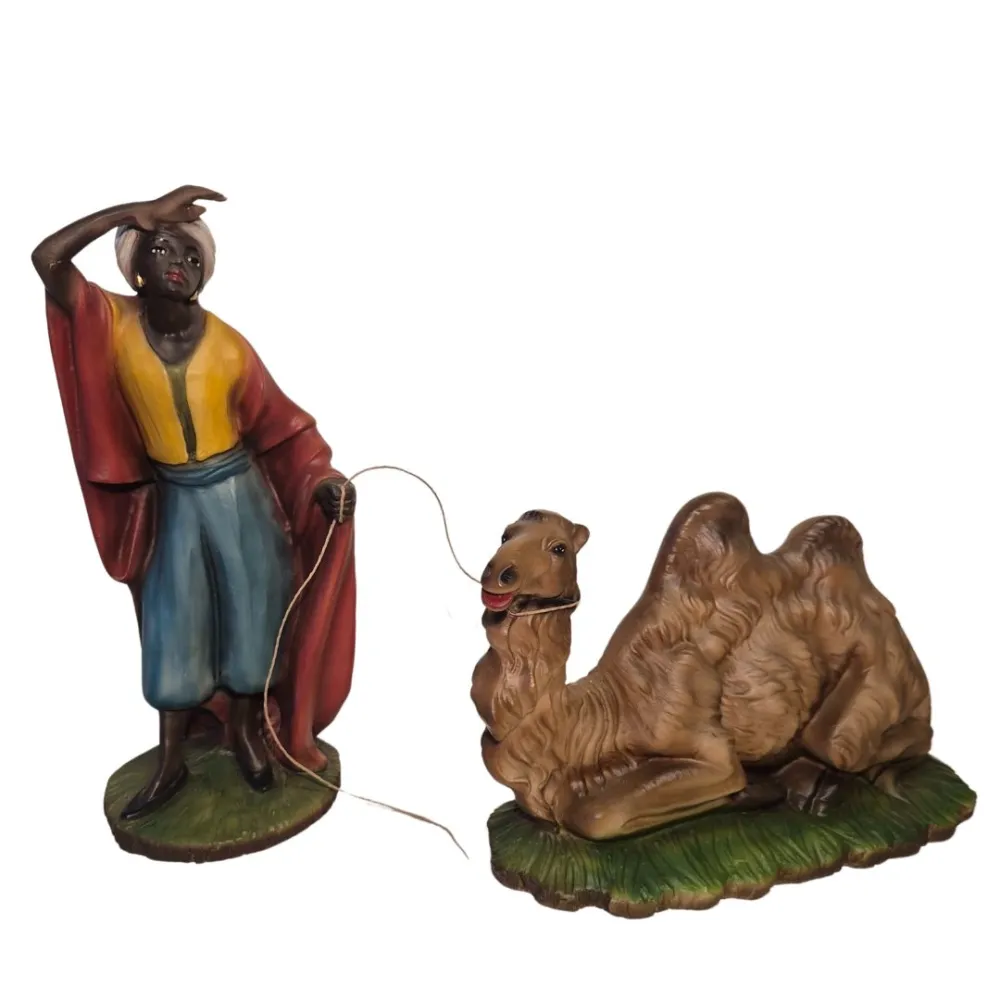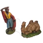 Moorish Camel Driver with Camel in Resin – 28 cm Series. This high-quality handcrafted resin Nativity figure is carefully made and finished in every detail, reflecting the excellence of Tuscan craftsmanship. The statue depicts a camel driver accompanied by his camel, both classic elements of the Nativity scene. The camel driver wears a vividly colored tunic and adopts an attitude that suggests searching or seeking direction. With one hand raised, he gazes toward the horizon, while the other holds a rope tied to the camel, which is shown resting calmly beside him. The camel, rendered with realistic details and a peaceful posture, adds authenticity to the scene and symbolizes the long journey undertaken by these travelers. Rich in symbolic meaning, this figure enhances the Nativity display by adding depth to the landscape and recalling the journey toward the Child Jesus. The combination of the two figures makes this piece especially significant for the presepe, with the camel representing travel, endurance, and the path leading to the Holy Family.