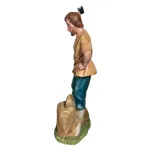 Woodcutter in Resin – 30 cm. This resin Nativity figure depicts a woodcutter engaged in splitting firewood. With his right hand, he raises an axe, ready to strike the log in front of him, while his left hand rests on his hip, giving balance and stability to his stance. He wears a sand-colored tunic tied at the waist, dark green trousers, and sturdy footwear typical of outdoor labor. At his feet lie cut logs and an intact stump, clear signs of the work in progress. The focused expression and firm gesture effectively convey the physical strength and daily effort associated with this traditional craft, adding realism and a sense of everyday life to the Nativity scene.