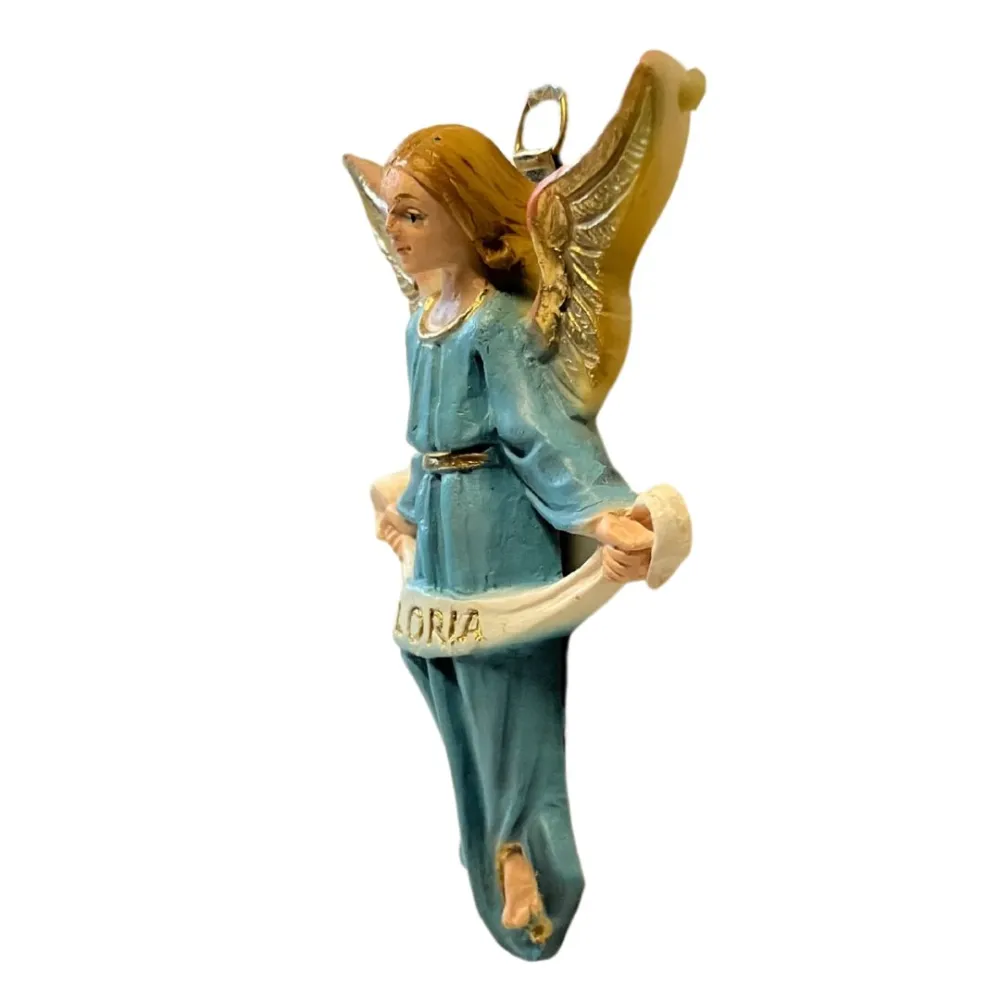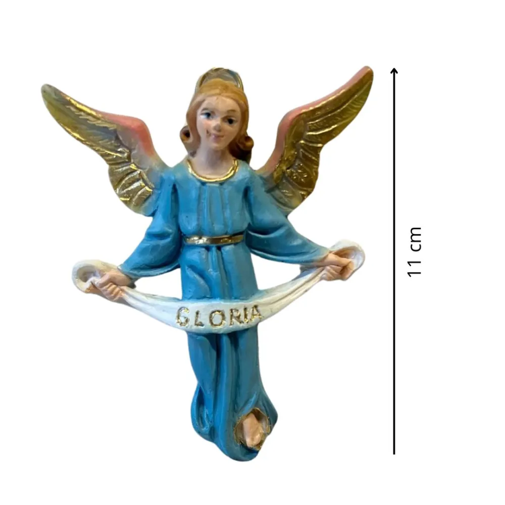 Etruria“Gloria” Angel – Hanging, Resin, for 12 cm Nativity Figures. This high-quality handcrafted figure is carefully made with great attention to detail, reflecting the excellence of Tuscan craftsmanship. The statue depicts an announcing angel, designed to be hung above the Nativity scene. The angel wears a light blue robe with a golden belt and holds a scroll bearing the word “Gloria.” The wings, finished in gold with soft rosy shading, add a luminous and graceful touch, enhancing the spiritual atmosphere of the Nativity display.