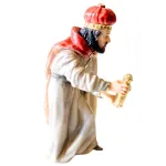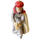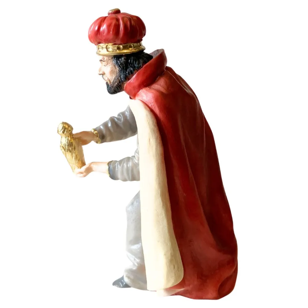 Wise Man with Myrrh – Hand-Painted Resin, 20 cm Series. This hand-painted resin statue from the 20 cm series depicts one of the Three Wise Men in the act of offering myrrh. It is a high-quality handcrafted piece, carefully created with great attention to detail, reflecting the excellence of Tuscan craftsmanship. The figure has a solemn bearing and an intense expression, framed by dark hair and a red crown adorned with golden details. He wears a pearl-grey robe with a light-colored mantle lined in red, finished with golden ornaments that add brightness and elegance to the overall composition. In his hands, he holds a finely crafted golden vessel, symbolizing myrrh—the gift that represents Christ’s humanity and future suffering. A figure of great elegance and symbolic meaning, perfect for completing the Adoration scene in the Nativity display.