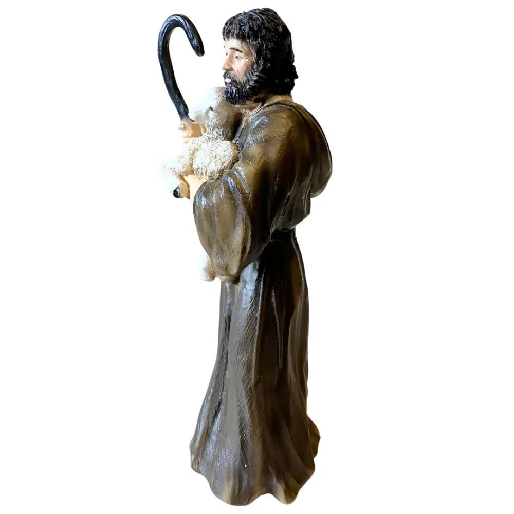EtruriaShepherd with Lamb – Hand-Painted Resin, 20 cm Series. This hand-painted resin statue from the 20 cm series depicts a shepherd holding a lamb in his arms. It is a high-quality handcrafted piece, carefully created with great attention to detail, reflecting the excellence of Tuscan craftsmanship. The figure features a bearded face that conveys tenderness and protection, while the posture expresses calm and devotion. He wears a brown tunic with natural folds and holds a dark pastoral staff in his right hand, a symbol of guidance and guardianship. Cradled in his arms is a white lamb, delicately modeled to represent purity and innocence. A classic and essential character for enriching the pastoral setting of a Nativity scene.