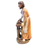 Carpenter at Work in Resin – suitable for 12 cm Nativity Figures. This resin figure depicts a craftsman at work, planing wood at his workbench with a natural, focused posture. The table, tools, and scenic base are finely detailed, evoking the simple, industrious atmosphere of traditional artisan workshops. His clothing, featuring an apron and a shirt with rolled-up sleeves, is finished in sober, realistic tones that enhance the authenticity of the scene. Ideal for enriching work settings and everyday life scenes within the Nativity, this figure adds realism and narrative depth to the display.