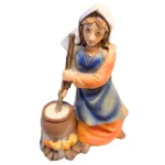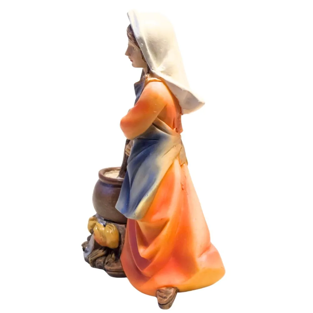 Woman Stirring Polenta in Resin – suitable for 10 cm Nativity Figures. This resin figure depicts a woman stirring polenta in a cauldron set over the fire, shown in a natural and well-balanced pose. The wooden stick, the cooking pot, and the scenic base with logs and embers are carefully detailed, evoking a typical domestic scene from rural tradition. Her clothing is finished in warm, harmonious tones, while her facial expression conveys focus and the rhythm of everyday life. Ideal for completing kitchen settings, courtyards, or domestic corners within the Nativity, this figure adds realism and a sense of traditional home life to the scene.