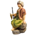 Seated Young Fisherman in Resin – suitable for 10 cm Nativity Figures. This resin figure depicts a young fisherman in a relaxed pose, holding a fishing rod with a freshly caught fish hanging from the hook. Beside him is a small basket, which completes the scene with balance and realism. His facial expression is gentle and serene, while the simple clothing—featuring loose trousers and a head covering—recalls traditional attire. Ideal for riverbank settings, ponds, coastal scenes, or everyday life corners of the Nativity, this figure adds a calm, authentic touch to the display.