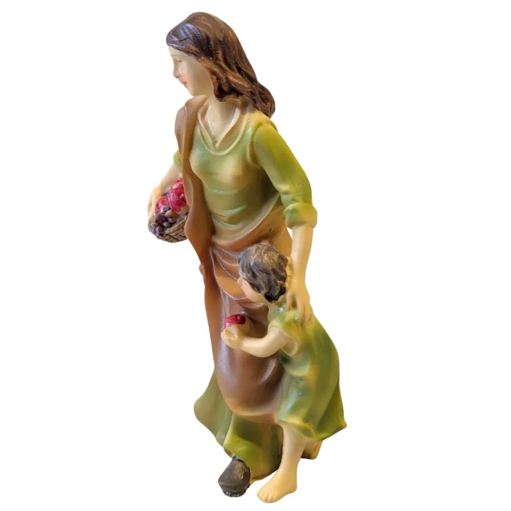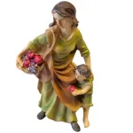 Woman with little boy and fruit, crafted in resin, suitable for nativity scenes with 10 cm nativity figures. The figure depicts a woman standing upright, holding a basket filled with fruit, while accompanying a little boy who is holding a piece of fruit in his hands. The scene is well balanced and natural, reflecting everyday life in a village setting. The sculpting is finely detailed, with careful attention to the facial features, clothing, and fruit, all enhanced by harmonious and realistic color tones. An ideal addition for family scenes, market settings, or village streets within the nativity scene.
