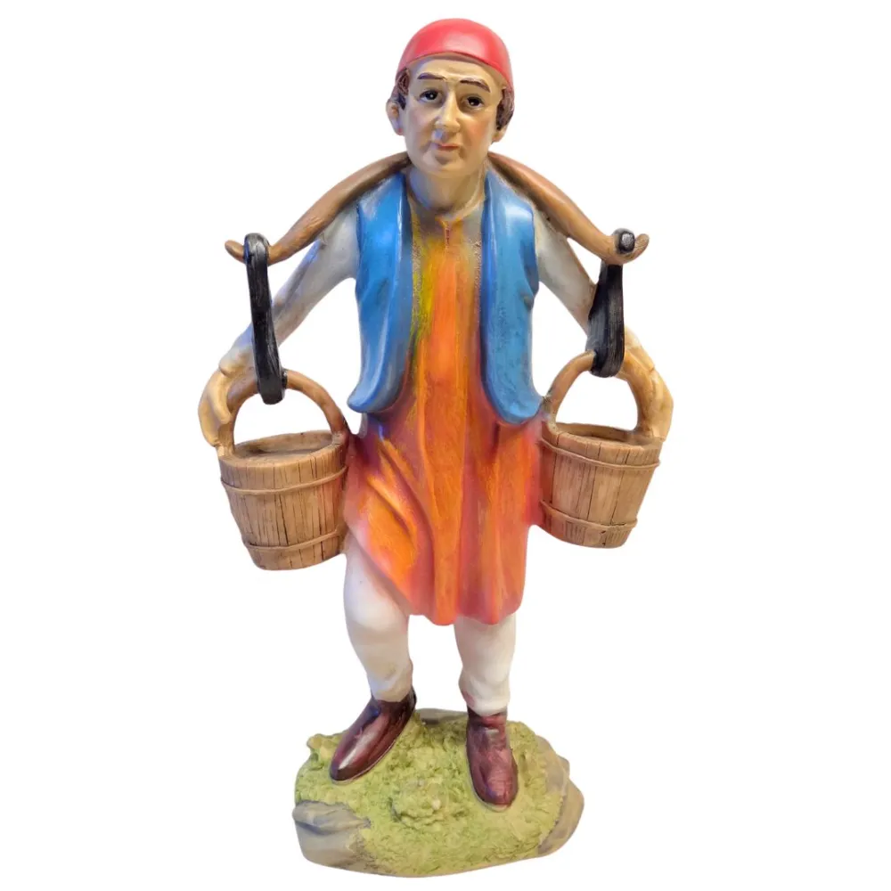 Water carrier in resin, 30 cm. The figure depicts a water seller carrying two buckets hanging from a pole resting across his shoulders, a traditional tool used for transporting water through village streets. The pose and the details of the buckets and clothing make this figure ideal for enriching everyday life scenes within the nativity display, especially along village paths or near fountains and wells.